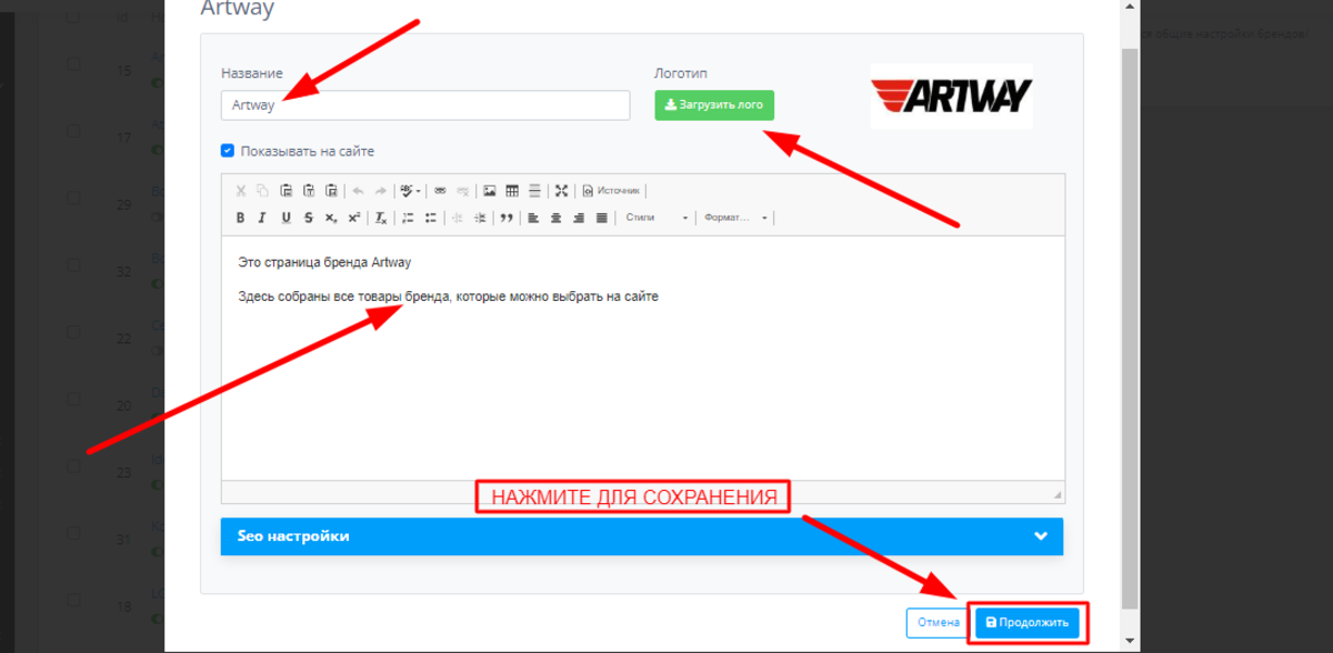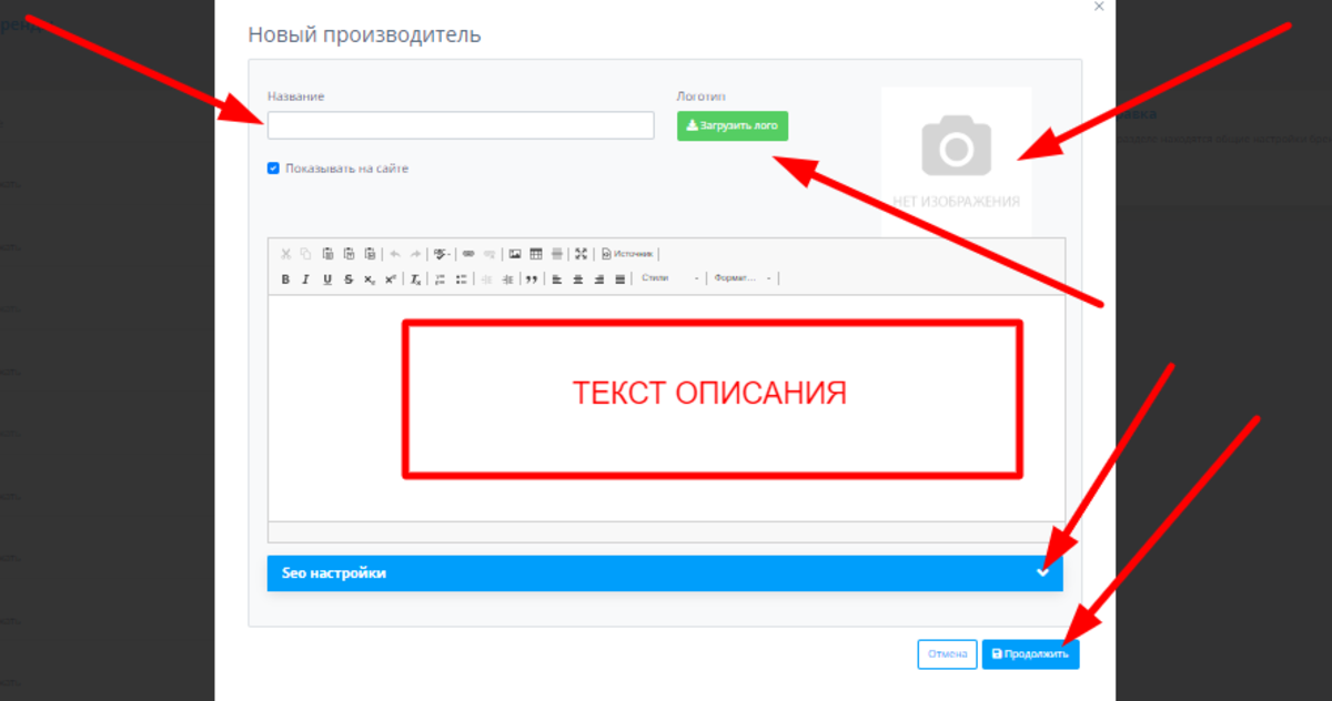 В верхнее поле впишите название бренда, загрузите логотип, в поле текстового редактора наберите небольшое описание торговой марки. На плашке «SEO настройки» справа нажмите флажок для внесения мета тегов — они помогут поисковым системам найти ваши товары. Если хотите сохранить все эти сведения, нажмите на кнопку «ПРОДОЛЖИТЬ» в правом нижнем углу формы. Если нажмете «ОТМЕНА», только что внесенные данные не сохранятся.
