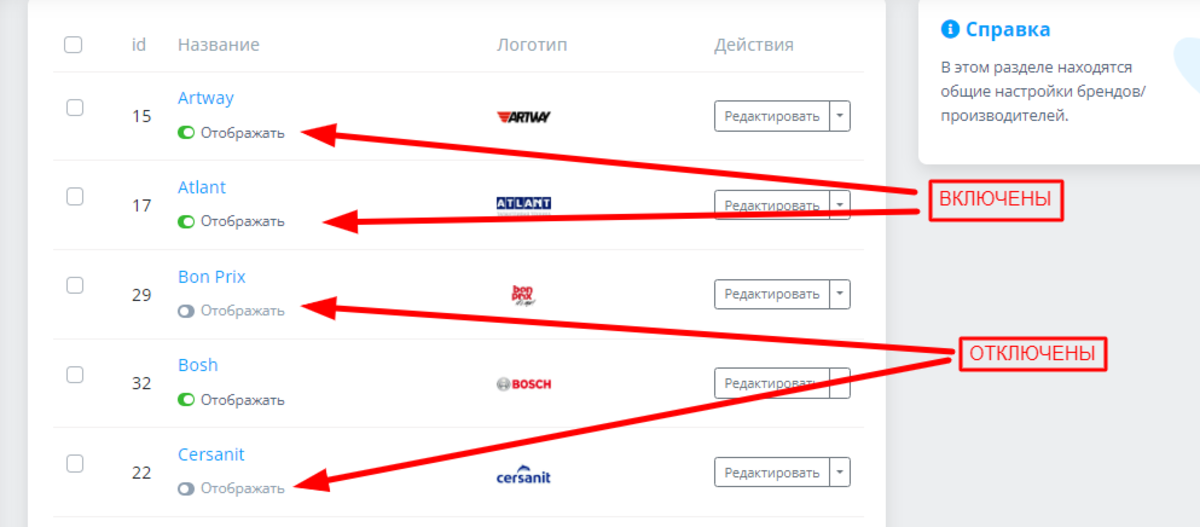 Обратите внимание на переключатель под названием каждого бренда. Вы можете включить или выключить отображение данной марки в своем интернет-магазине простым переводом этого рычажка влево-вправо. Если он переведен влево и выглядит серым, бренд отключен. Если сдвинут вправо и отображается зеленым, значит производитель отображается на сайте: