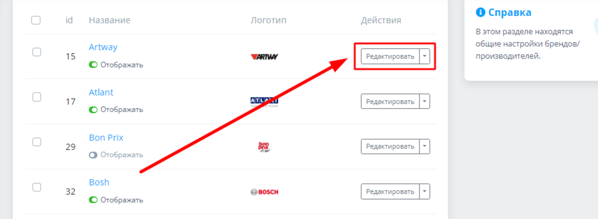И, наконец, выбранный бренд можно удалить. Для этого необходимо нажать на флажок рядом с кнопкой "РЕДАКТИРОВАТЬ" и выбрать пункт "УДАЛИТЬ":