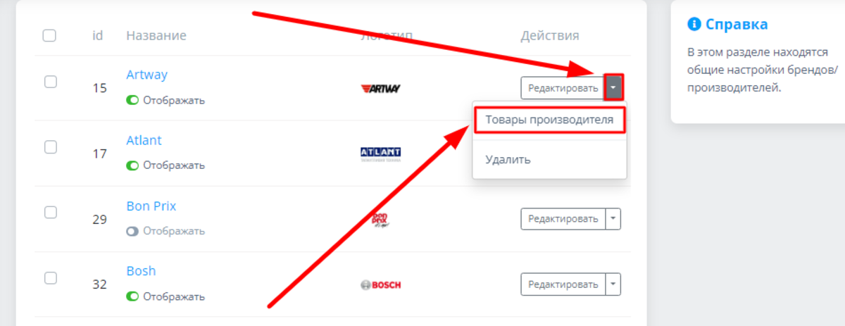 Если вы выберете пункт "ТОВАРЫ ПРОИЗВОДИТЕЛЯ", то сможете просмотреть все товары данного бренда, представленные в вашем магазине. При нажатии на него открывается страница, позволяющая управлять этой группой товаров: