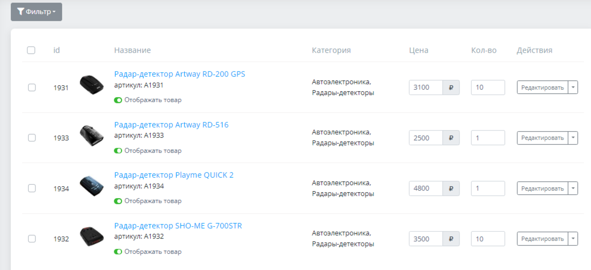 · возможность удалять выбранный товар, просматривать его на сайте, проставлять в карточках товаров необходимые для повышения продаж отметки («новинка», «хит продаж» и т. п.);