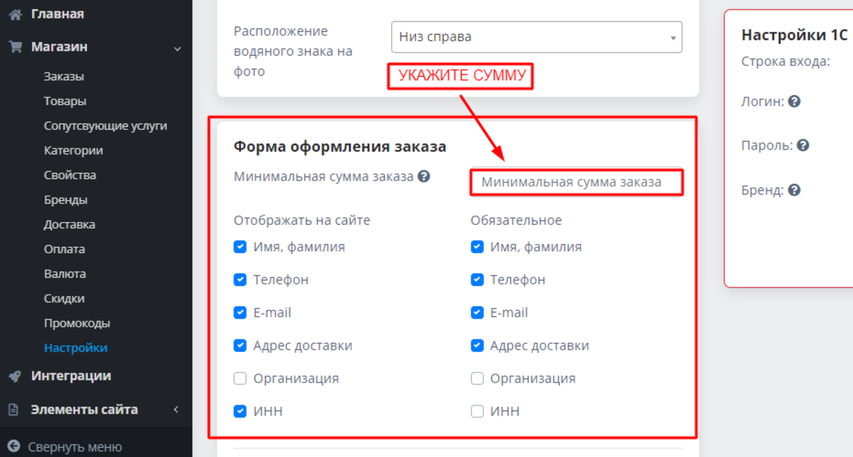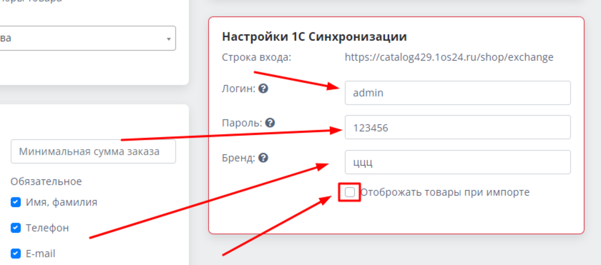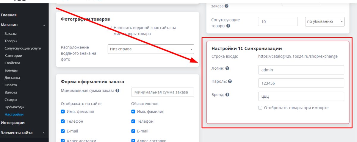 Вам требуется придумать и вписать в соответствующие поля логин и пароль, по которым будут связываться ваш сайт и 1С. Кроме того, важно корректно заполнить поле "БРЕНД", поскольку в 1С это свойство будет сохранено как "Производитель". Поставьте или снимите галочку в поле "Отображать товары при импорте":
