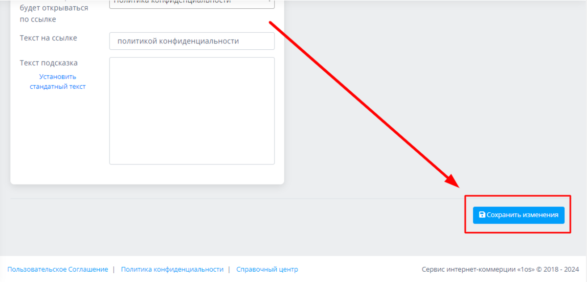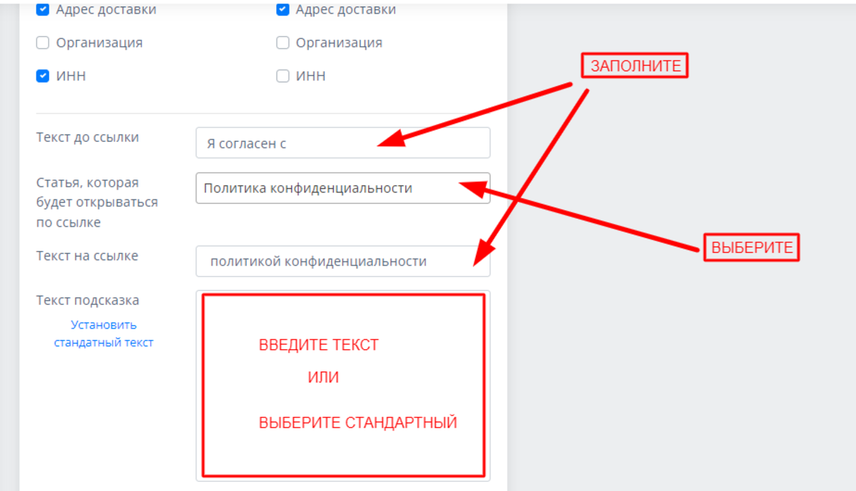 Очень важно корректно заполнить нижеследующие поля, поскольку наличие политики конфиденциальности на сайте регулируется законодательно. В поле текста-подсказки вы можете написать свой собственный текст или выбрать опцию "Установить стандартный текст":