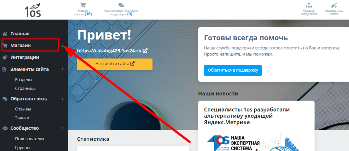 Теперь перед вами все возможности для администрирования. То, что нам нужно в данный момент, находится в левом вертикальном меню — пункт «МАГАЗИН»:
