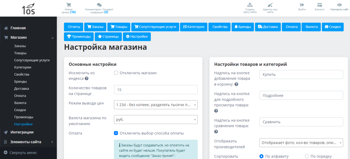 Настройки товаров и категорий