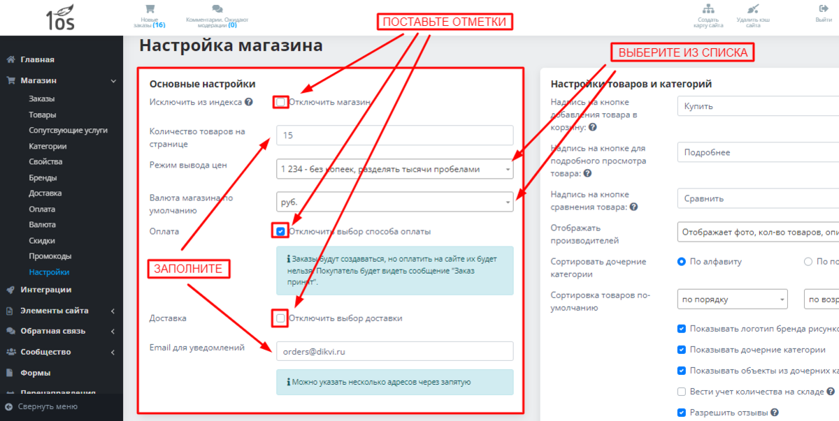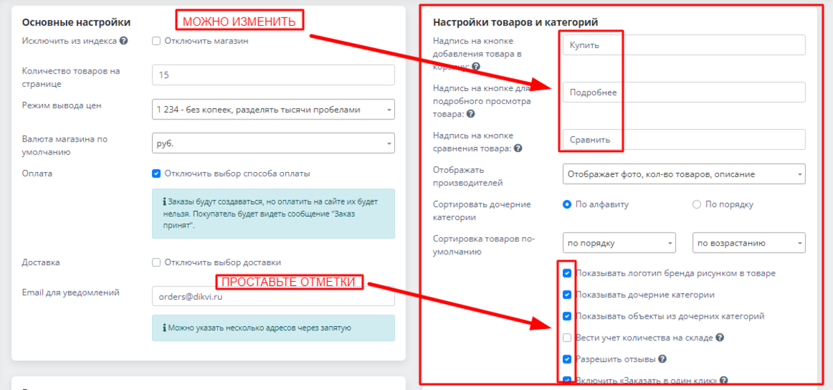 В этот блок сведены все ключевые функции по управлению магазином. Отсюда его можно включить или отключить. Здесь вы определяете, сколько товаров будет отображаться у покупателя на странице и как будут представлены цены. Есть возможность включения и отключения выбора клиентом способов оплаты и доставки. Присутствует поле, куда вы внесете е-мейл для получения уведомлений с сайта магазина. Заполните основной блок: