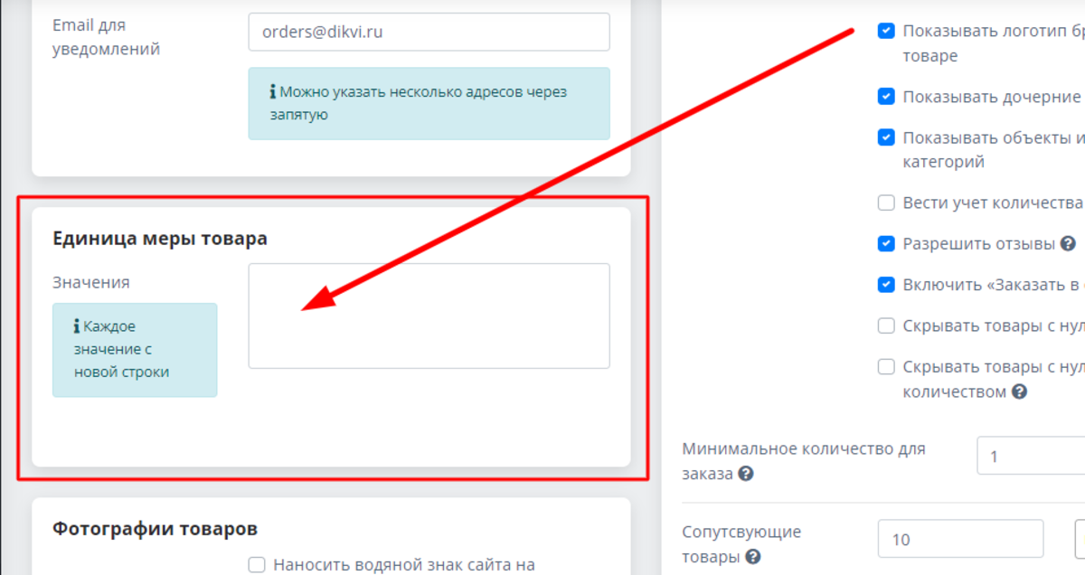 Мы предусмотрели отдельный блок для указания единицы меры товара. Вам просто нужно вписать требуемую информацию в свободное поле. Обратите внимание - каждое значение указывается с новой строки: