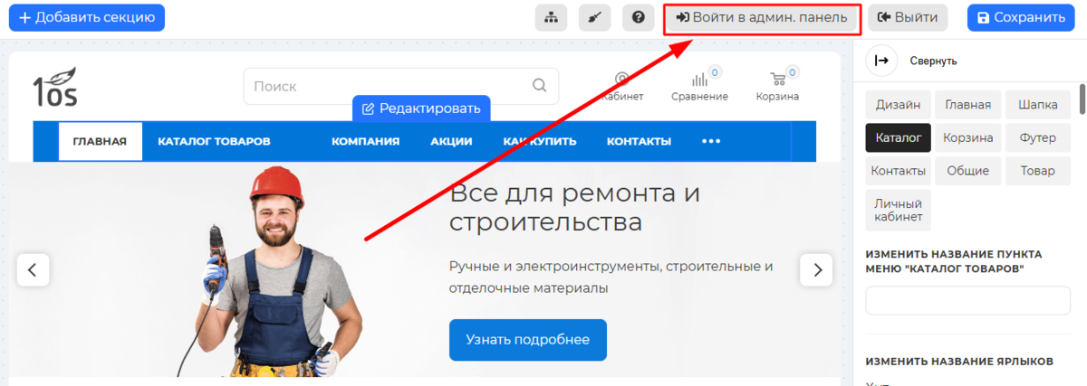 Для начала необходимо выполнить стандартный вход. Он подробно расписан в соответствующей инструкции — просто пройдите все этапы, соблюдая их последовательность и внимательно выполняя каждый шаг. После попадания в служебный раздел своего сайта найдите справа верху кнопку "Войти в админ. панель". При ее нажатии вы переходите в административную панель магазина: