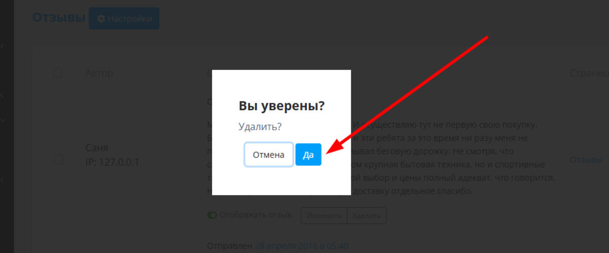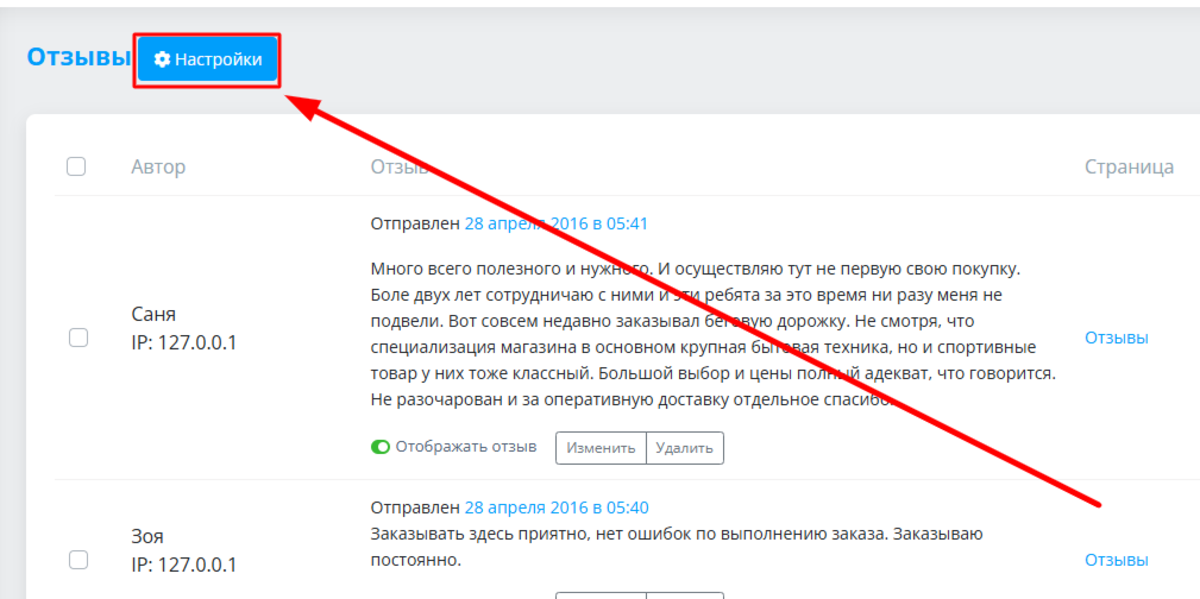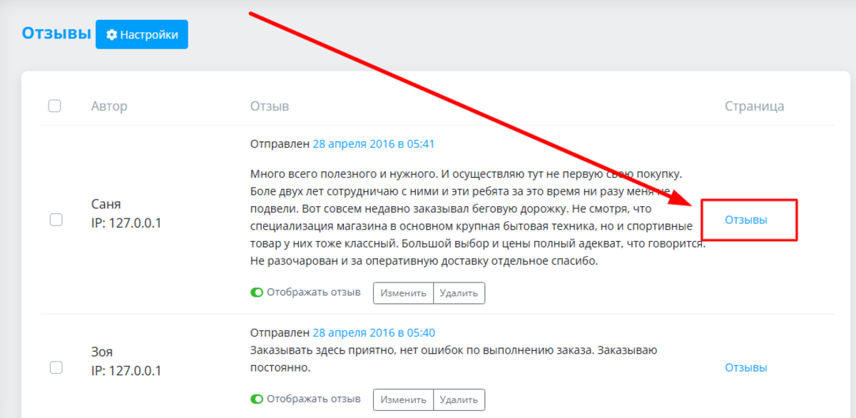 Здесь можно поработать с настройками, задать отображение отзыва на сайте, изменить его по своему усмотрению. При необходимости конкретный отзыв можно даже удалить. Для всех этих манипуляций предусмотрены активные кнопки, имеющие соответствующие надписи.
