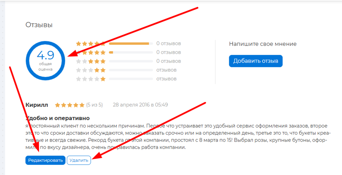 Мы попадаем на страницу отзывов. Вы можете увидеть обобщенную статистику, а также отдельные отзывы. Обратите внимание! Здесь также доступны функции редактирования и удаления конкретных отзывов: