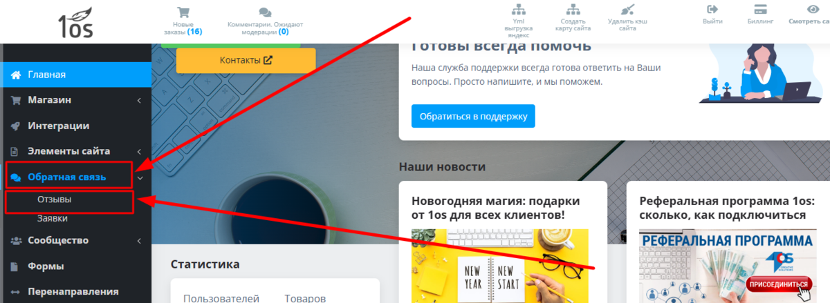В левой части страницы есть меню с многочисленными опциями. Нас интересует пункт «ОБРАТНАЯ СВЯЗЬ». Кликните на флажок рядом с ним - откроется небольшое подменю. Выбираем пункт «ОТЗЫВЫ» и нажмем на него: