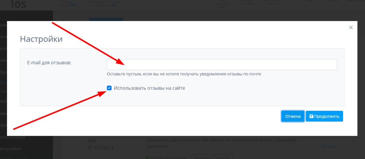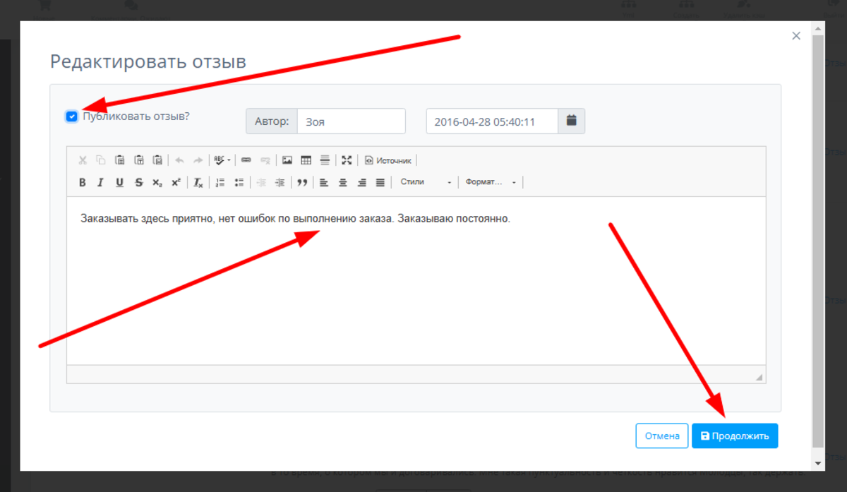 Здесь вы также можете поставить или снять отметку «ПУБЛИКОВАТЬ ОТЗЫВ». Соответственно, он либо исчезнет из общедоступной части сайта, либо отобразится там. Если вы хотите сохранить изменения, нажимайте «ПРОДОЛЖИТЬ», иначе жмите «ОТМЕНА».