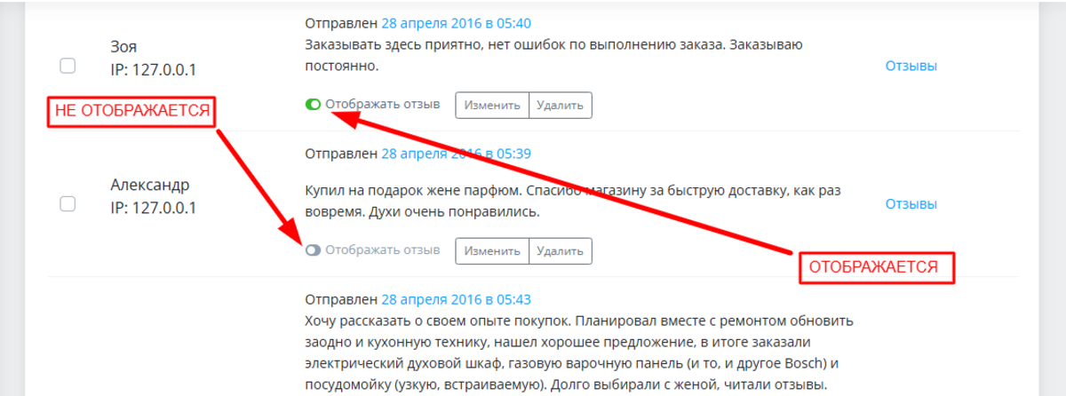 Под каждым отзывом вы можете наблюдать бегунок-индикатор. Когда он смещен вправо и светится зеленым, то означает «отображать на сайте». Если рычажок сдвинут влево и выглядит серым, соответственно, «НЕ отображать»: