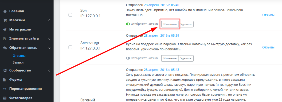 У вас, как у главного в своем магазине, есть все полномочия менять содержание отзывов. Вы, например, можете изъять ненормативную лексику или исправить режущую глаз опечатку. Для этого под текстом отзыва нажмите кнопку «ИЗМЕНИТЬ»: