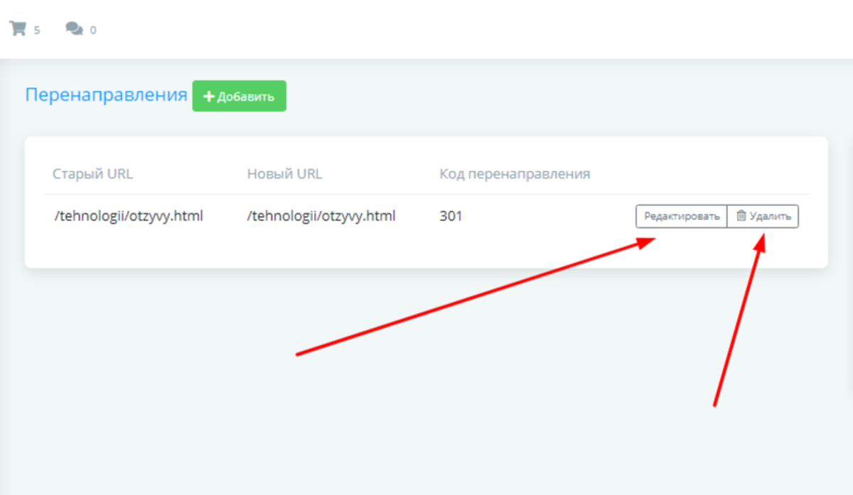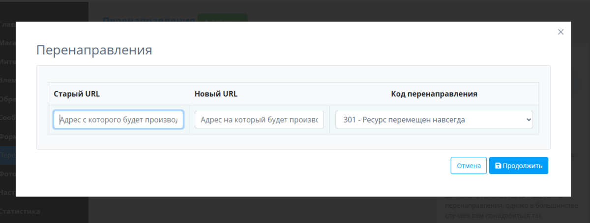 Нажмем кнопку «ДОБАВИТЬ». Для нас открывается форма, куда нужно внести все данные (старый адрес страницы, новый адрес, код):