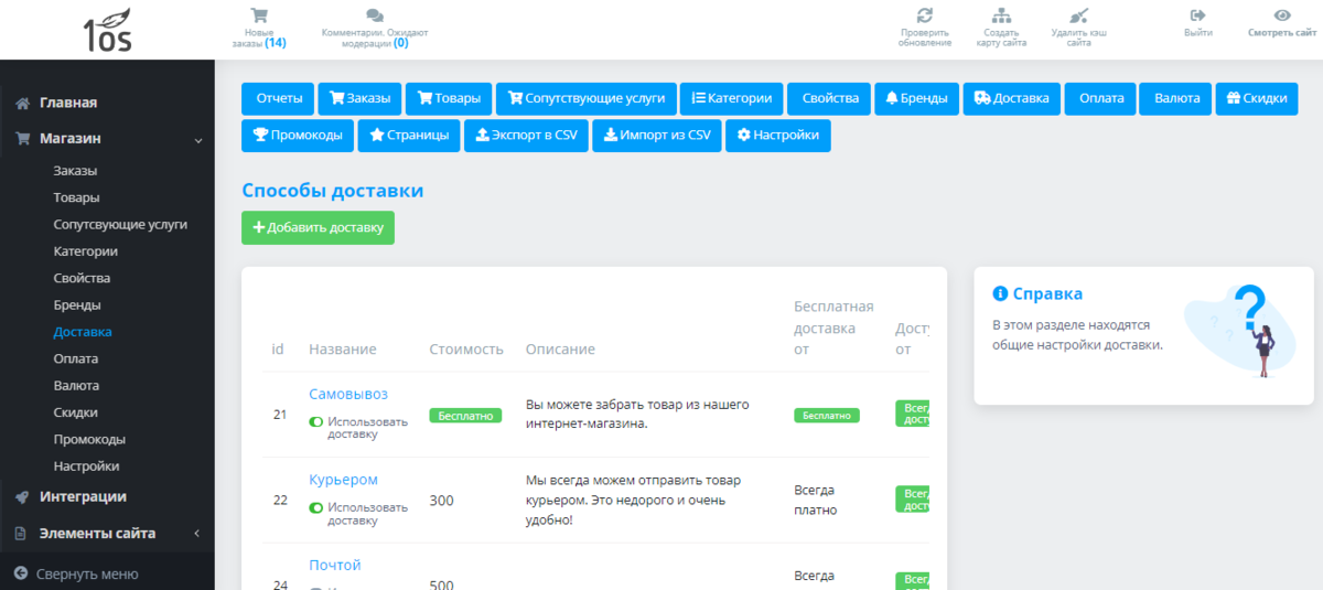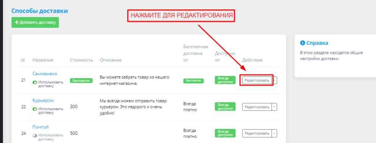 Раздел «ДОСТАВКА» устроен очень просто. Он представляет собой сведенные в таблицу способы доставки, которые уже добавлены на сайт. Их можно удалять, включать и выключать в один клик, вносить необходимые изменения в любой пункт. Также есть важная кнопка вверху над таблицей, которая позволяет добавлять новый вид доставки с указанием всех его характеристик.
