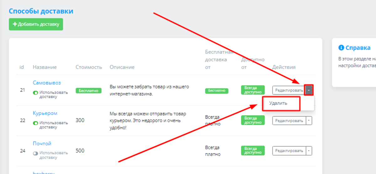 Если вы хотите удалить какой-либо вариант доставки, нужно нажать на "флажок" рядом с кнопкой "РЕДАКТИРОВАТЬ". Откроется маленькое подменю с дополнительной возможностью. Нажмите кнопку "УДАЛИТЬ":