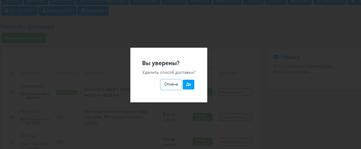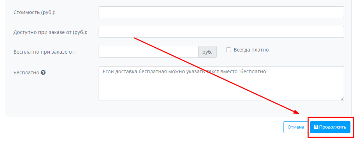 Если вы все же решили не вносить на сайт этот вид доставки, справа внизу нажмите «ОТМЕНА». Если приняли решение закрепить изменения в разделе, обязательно нажмите «ПРОДОЛЖИТЬ»: