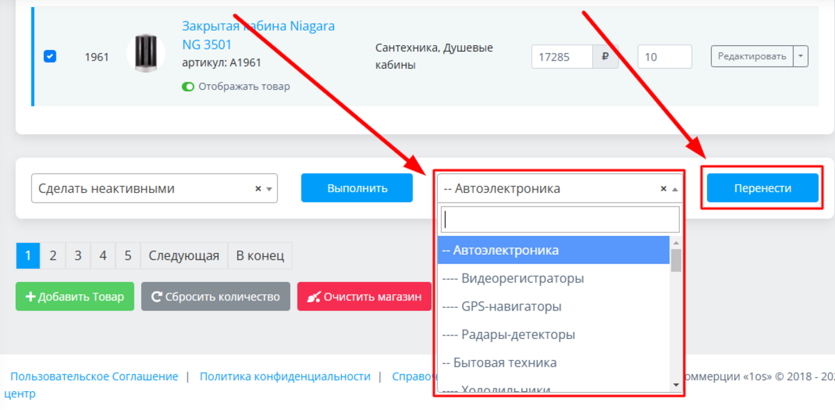 Точно так же работает и перенесение группы товаров в другую категорию через поле справа и кнопку «ПЕРЕНЕСТИ»: