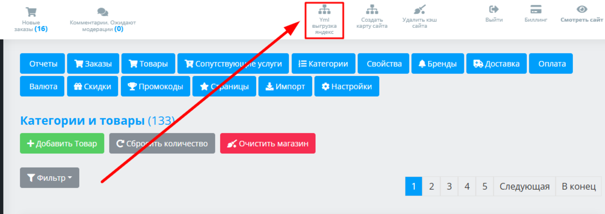 Если параллельно с собственным сайтом у вас есть магазин на Яндекс.Маркете, то ассортимент с сайта можно туда выгрузить автоматически одним файлом без необходимости вносить каждую отдельную позицию. Для этого вверху страницы найдите кнопку «yml выгрузка Яндекс»: