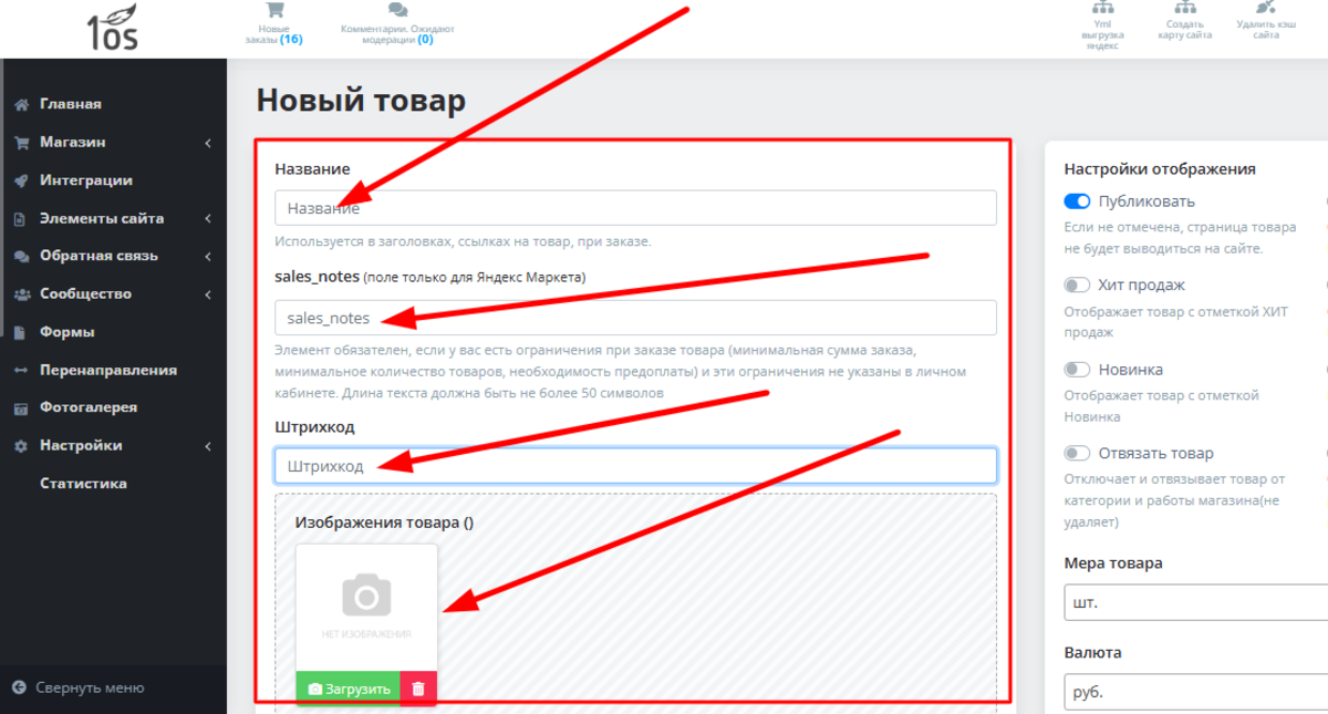 Для начала введите название товара, sales_notes (ели вы продаете этот товар на Яндекс Маркете), штрихкод, залейте 1 или несколько изображений товаров: