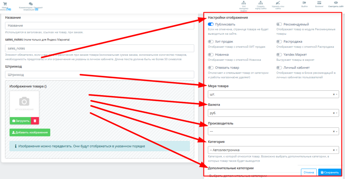 Далее на панели справа выберите настройки отображения, меру товара, валюту, производителя, основную и дополнительные категории:
