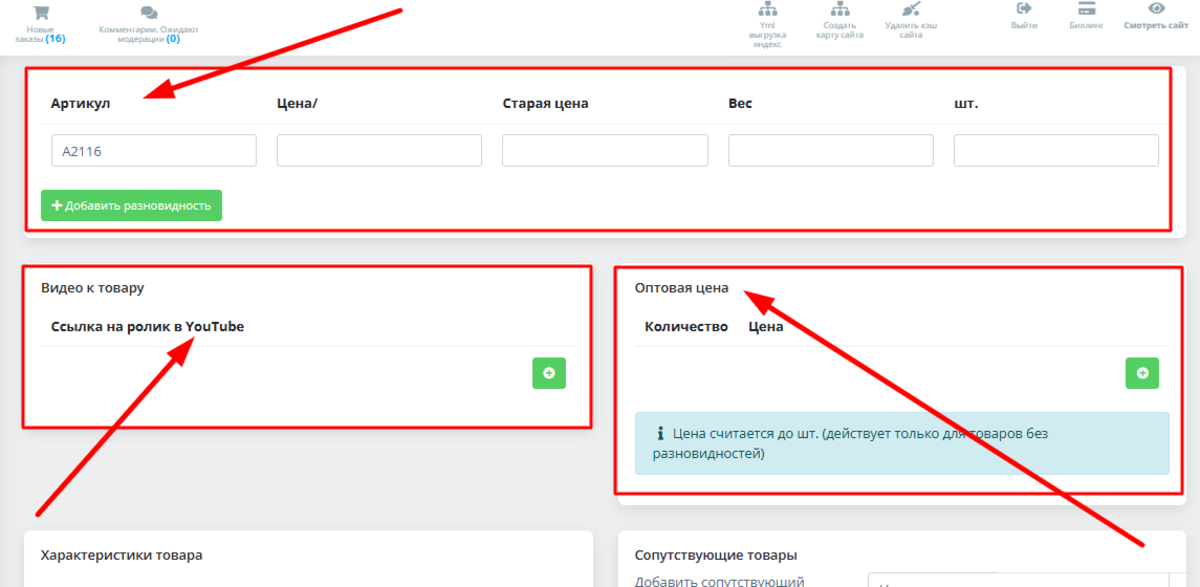 Обязательно внесите артикул и сопутствующую информацию. Здесь же вы можете добавить видео к товару. Для этого достаточно вставить ссылку в соответствующей графе и нажать зеленый "плюсик". Еще один важный блок - оптовая цена (укажите от какого количества считается опт и собственно цену):