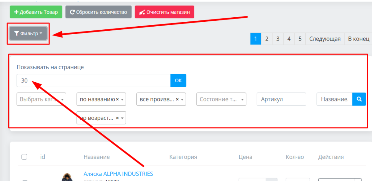 Это кнопки для добавления товара, сброса количества, очищения магазина, перехода на нужную страницу перечня товаров, поля для их сортировки. Основная часть панели представляет собой таблицу: в нее попадают сведения о товарах, и здесь же находятся инструменты для управления ими. Под таблицей — кнопки, позволяющие оперировать выделенными товарами и повторный блок для перехода на нужную страницу (это удобно, не придется постоянно листать вверх-вниз).