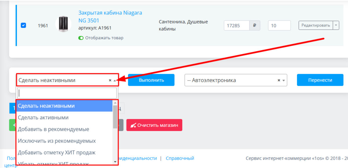 Конструктор предоставляет отличную возможность сэкономить время при работе с товарами. Если вам необходимо произвести одно и то же действие с несколькими позициями, отметьте их галочками в первой колонке, выберите действие из выпадающего списка и нажмите кнопку «ВЫПОЛНИТЬ»: