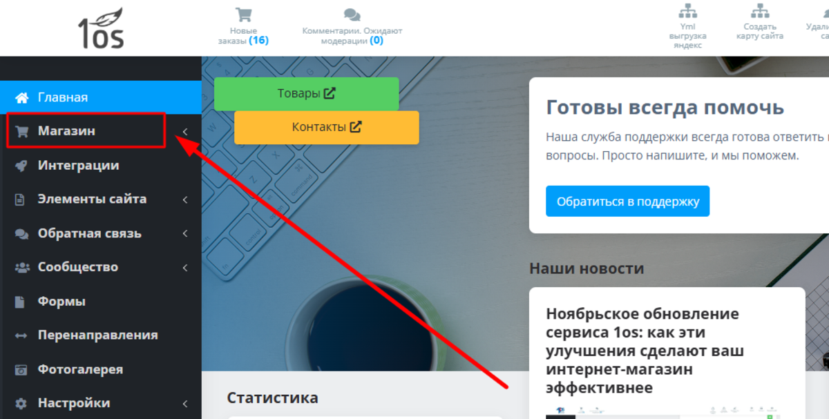 На открывшаяся странице видим левое вертикальное меню. Нажимаем «МАГАЗИН»: