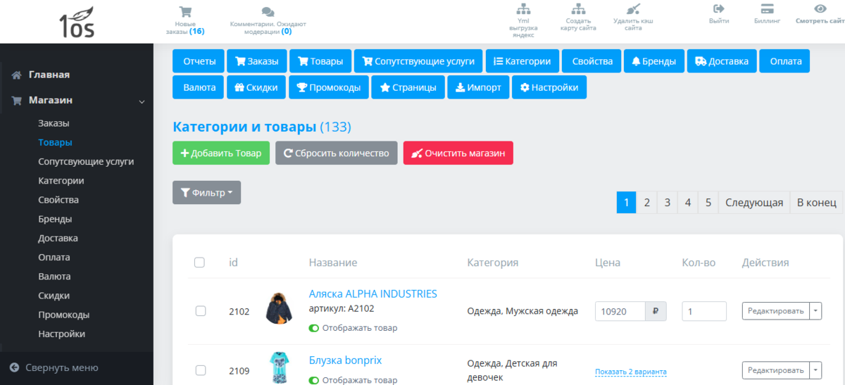 Панель управления товарами позволяет всегда держать ассортимент и цены актуальными. С функционалом сервиса интернет-коммерции 1os сделать это просто, особых навыков не требуется, и времени много не занимает.