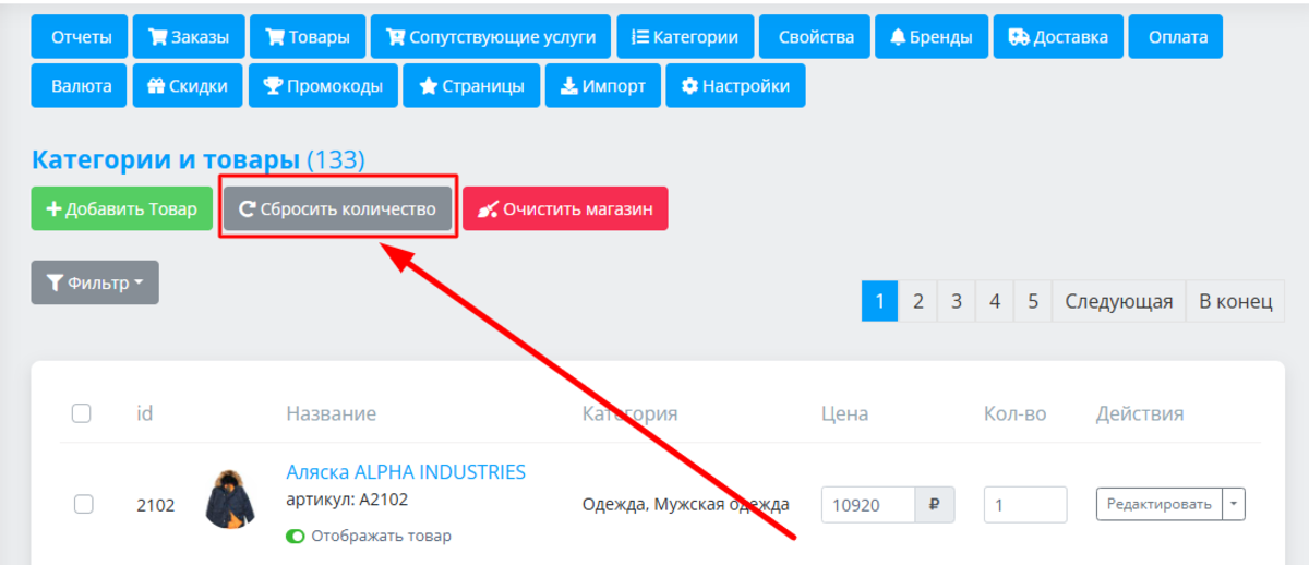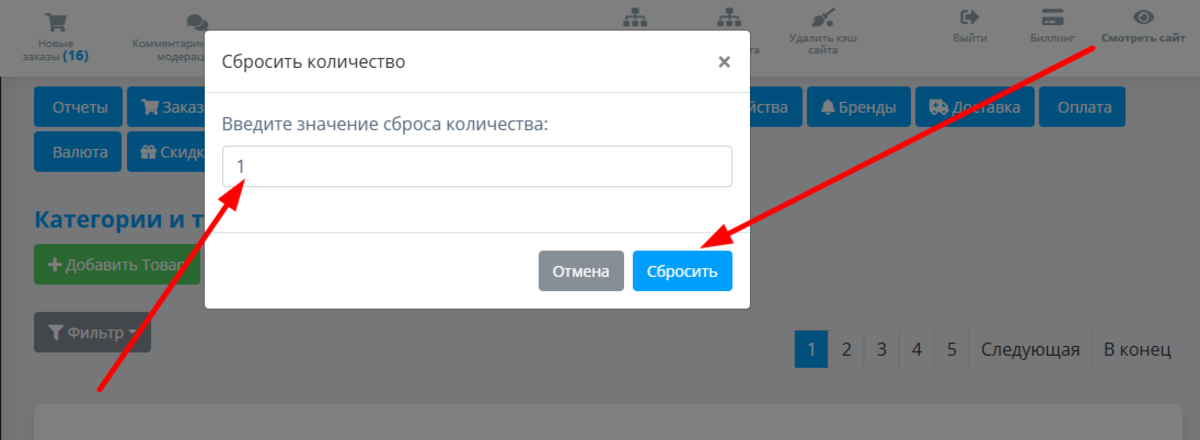Как сбросить количество товаров