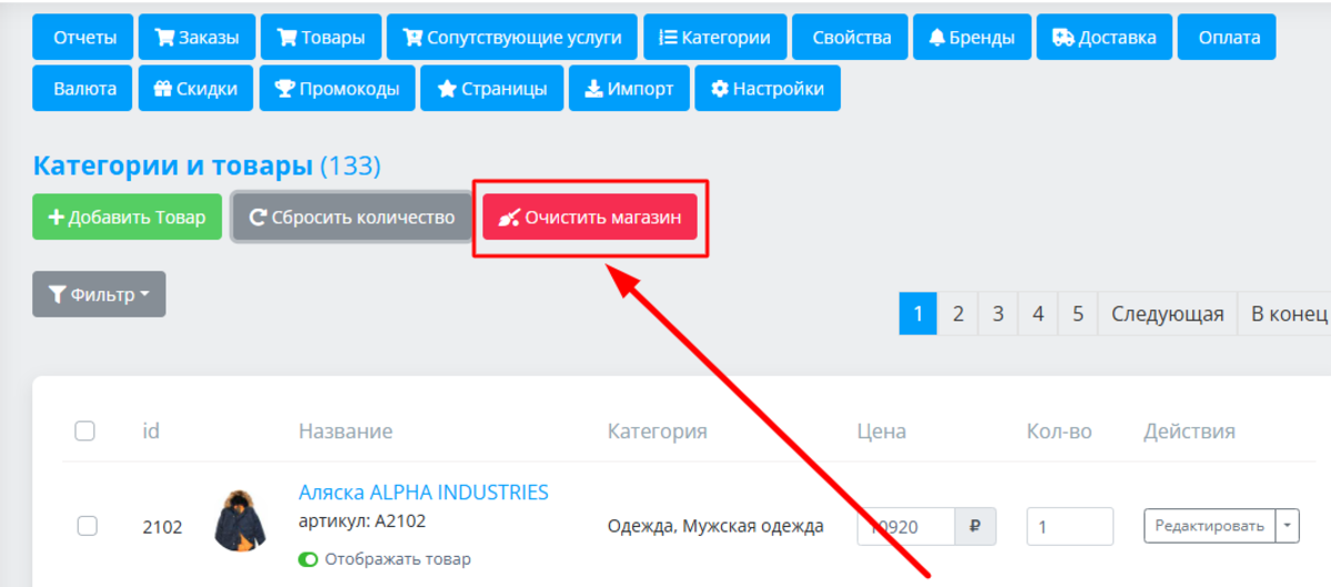 Нередки случаи, когда всю информацию о товарах и категориях нужно быстро удалить. Например, вы создавали тренировочный магазин, а теперь хотите сделать реальный. Сделать это просто - нажмите кнопку "ОЧИСТИТЬ МАГАЗИН":