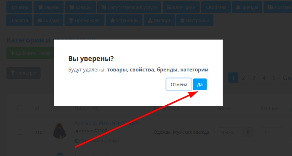 При нажатии на кнопку "ДА" будут окончательно удалены товары, свойства, бренды и категории. Если все это в ваши планы не входит, нажмите кнопку "ОТМЕНА".