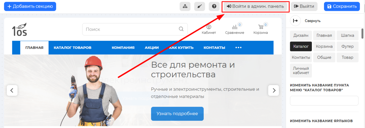 Чтобы попасть в раздел управления товарами, необходимо выполнить стандартный вход. Он пошагово описан в соответствующей инструкции — последовательно пройдите все этапы, внимательно выполняя каждый шаг. После попадания в личный кабинет сайта найдите вверху кнопку "ВОЙТИ В АДМИН. ПАНЕЛЬ". При ее нажатии вы переходите в административную панель магазина: