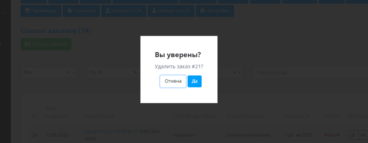 Если нажмете «ДА», заказ будет удален. Если выберете «ОТМЕНА», изменения внесены не будут, и вы вернетесь на страницу со списком заказов.