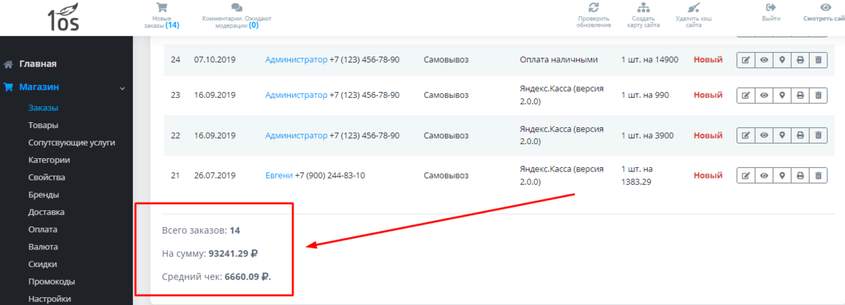 Чтобы работа вашего интернет-магазина была эффективной и приносила ожидаемый доход, необходимо постоянно мониторить статистику. На страницу заказов выведена самая важная текущая информация: общее количество заказов, общая сумма (оборот) и средний чек. Все это вы найдете под таблицей заказов слева в нижней части страницы: