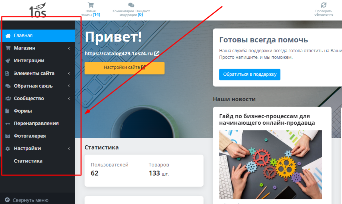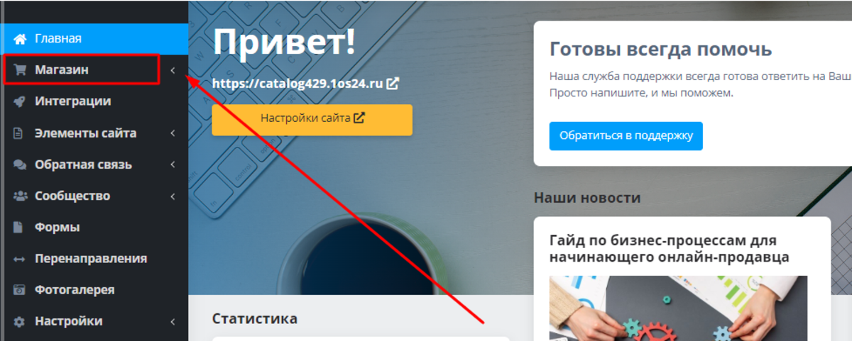Как и любое действие в конструкторе 1os, работу с заказами в вашем интернет-магазине мы начинаем со стандартного входа. Он пошагово описан в соответствующей инструкции — просто последовательно пройдите все этапы. После попадания в личный кабинет сайта найдите справа верху кнопку "ВОЙТИ В АДМИН. ПАНЕЛЬ". При ее нажатии вы переходите в административную панель магазина: