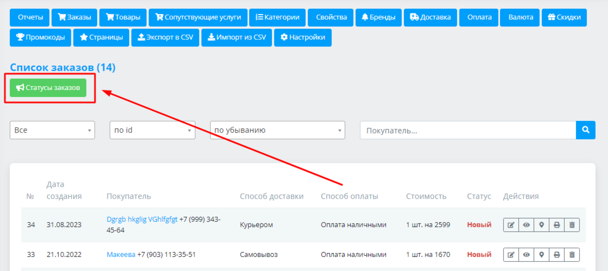 Эта удобная функция выполняет роль маячка. Она позволяет сразу видеть новые и выполненные заказы, отслеживать находящиеся в обработке и отмененные. Все они для удобства обозначены разным цветом. Чтобы воспользоваться этими возможностями, нажмите зеленую кнопку «СТАТУСЫ ЗАКАЗОВ»: