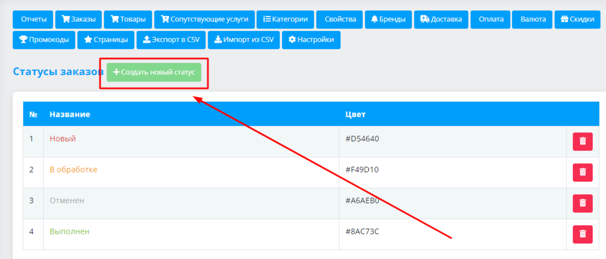 Вы видите текущий список статусов, которыми помечаются заказы. Чтобы добавить еще один статус (например, «проблемный»), нажмите «СОЗДАТЬ НОВЫЙ СТАТУС»: