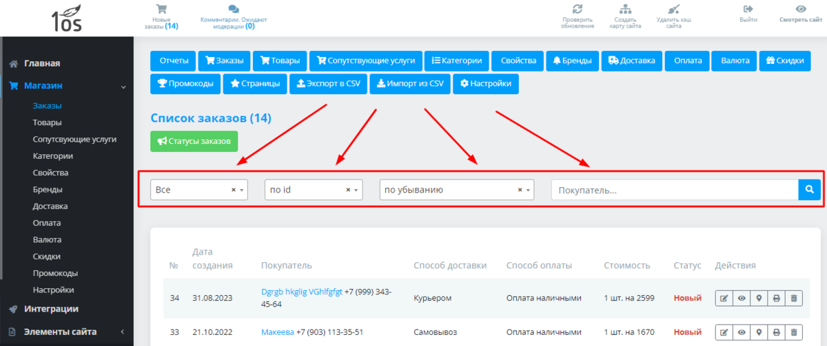 Следующий элемент страницы — таблица, в которую сведены все заказы и функции взаимодействия с ними. Здесь вы сразу видите порядковый номер заказа, имя и номер телефона покупателя, выбранный им способ доставки и оплаты, стоимость заказа и его статус.