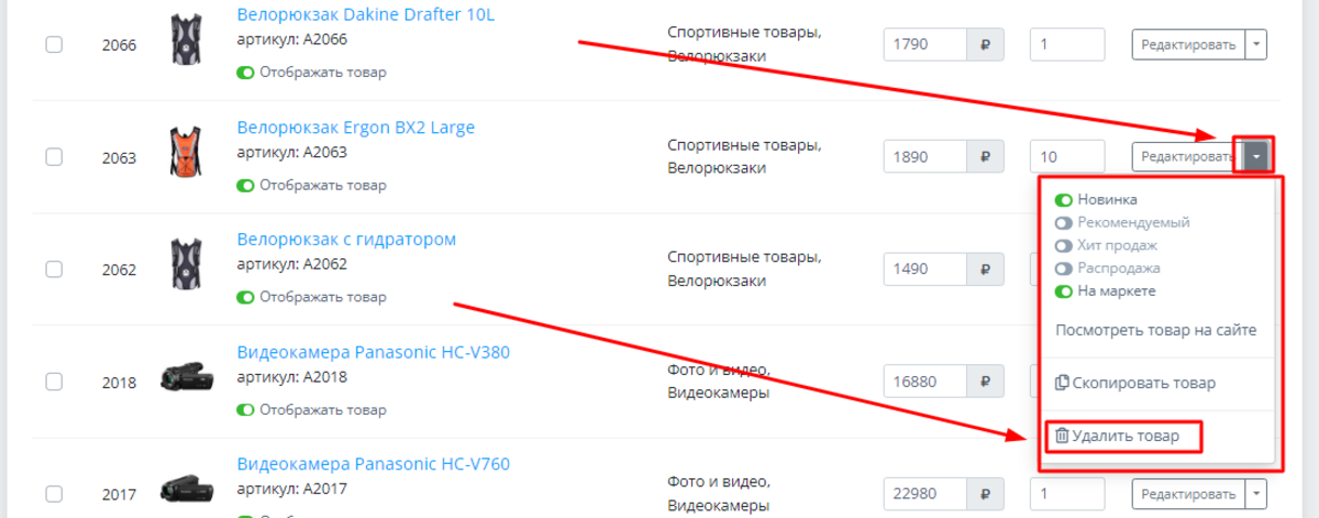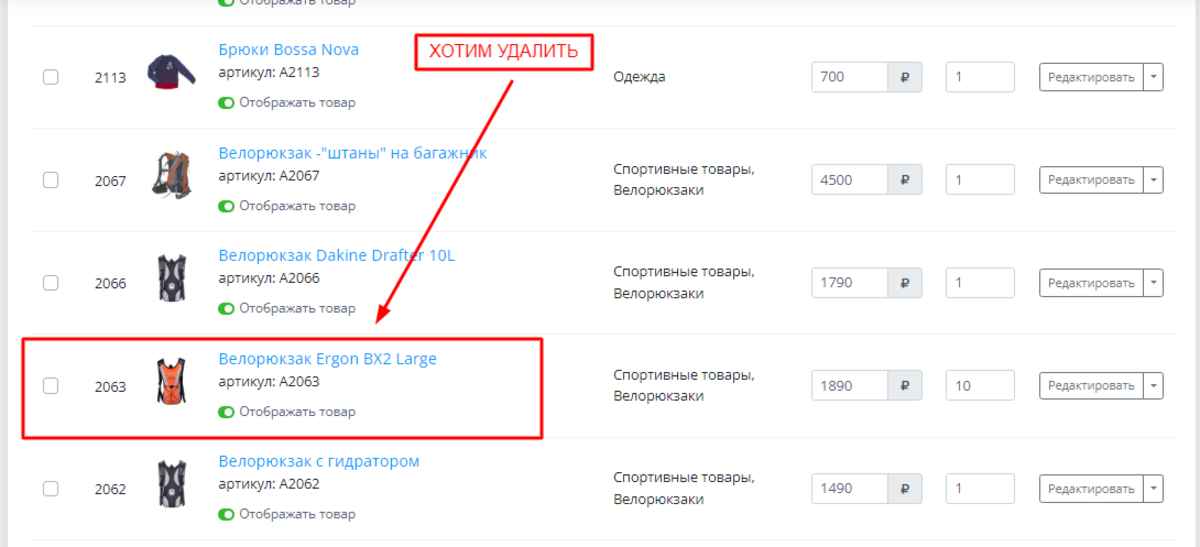 В строке товара в последней колонке есть кнопка «РЕДАКТИРОВАТЬ». Нажмем «флажок» рядом с ней, чтобы открыть дополнительный перечень возможных действий. Выбираем «УДАЛИТЬ ТОВАР» и нажимаем: