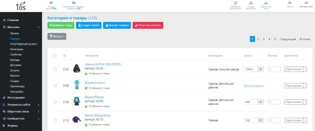 Если вы решили убрать с сайта один или несколько товаров, необходимо сделать следующее. В левом меню панели управления активируйте пункт «МАГАЗИН» и выберите «ТОВАРЫ»: