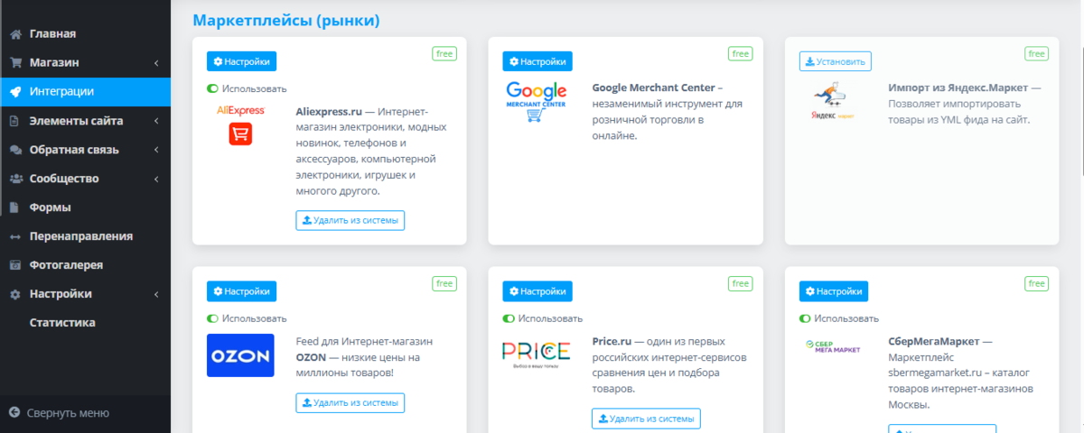 Перед вами открылась панель управления функциями магазина. Находим на ней левое вертикальное меню, вбираем пункт «ИНТЕГРАЦИИ» и нажимаем на него: